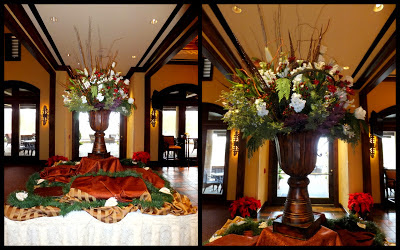 And no table scape is complete without a ridiculous amount of candles in goblet candle holders and crystal votive cups. On the buffet table was a fabulous, lush, and eye catching centerpiece filled with glittered birch branches, white stock, green hanging anthirium, red roses and beautiful evergreens. The aroma as you entered the dining room was amazing. It smelled just like Christmas!
