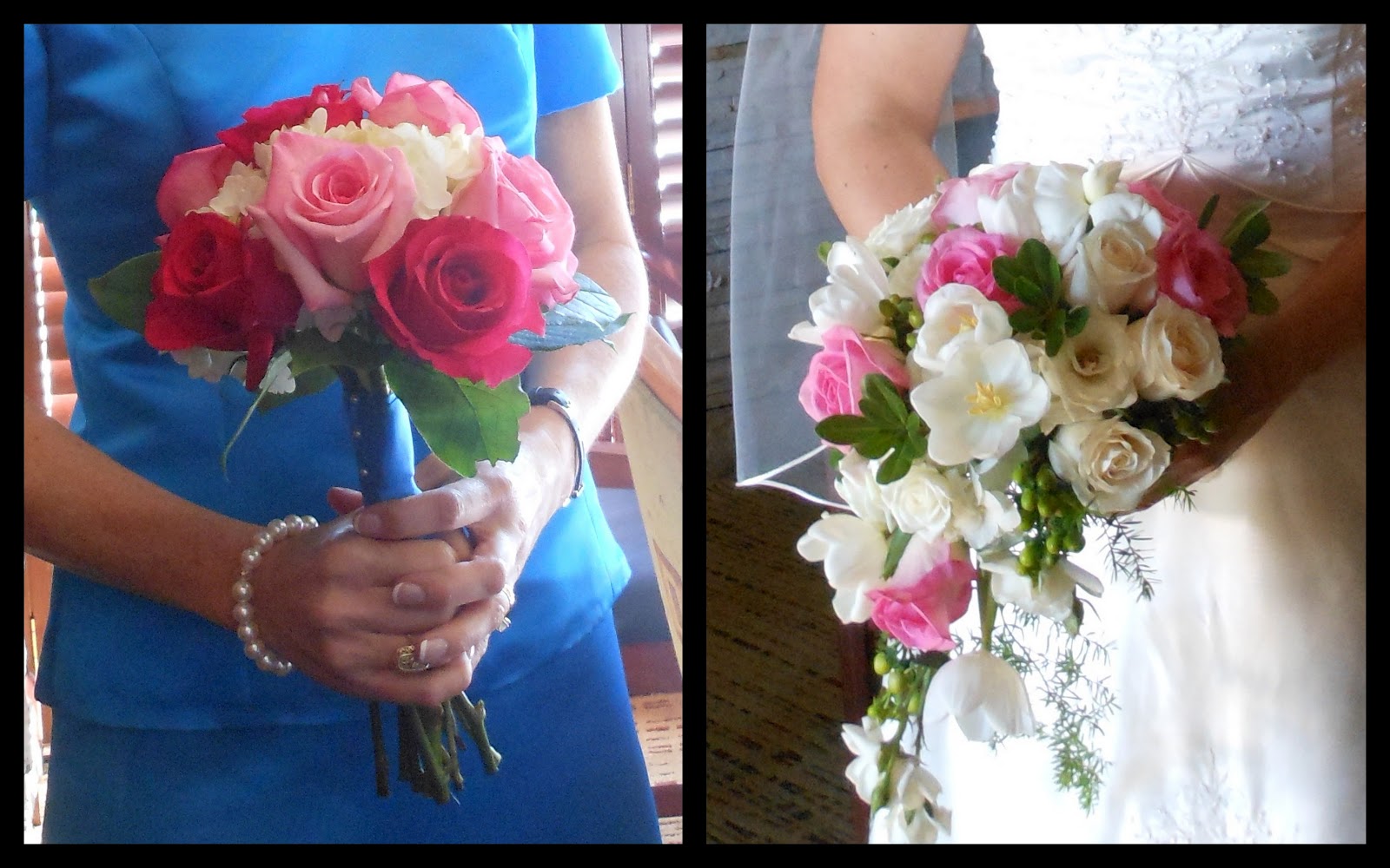 {Handtied bouquets: left to right: white hydrange with hot and medium pink roses wrapped in turquoise ribbon. A tear drop bouquet with white roses, medium pink roses, white lisianthus, white tulips and mixed draping greens.}