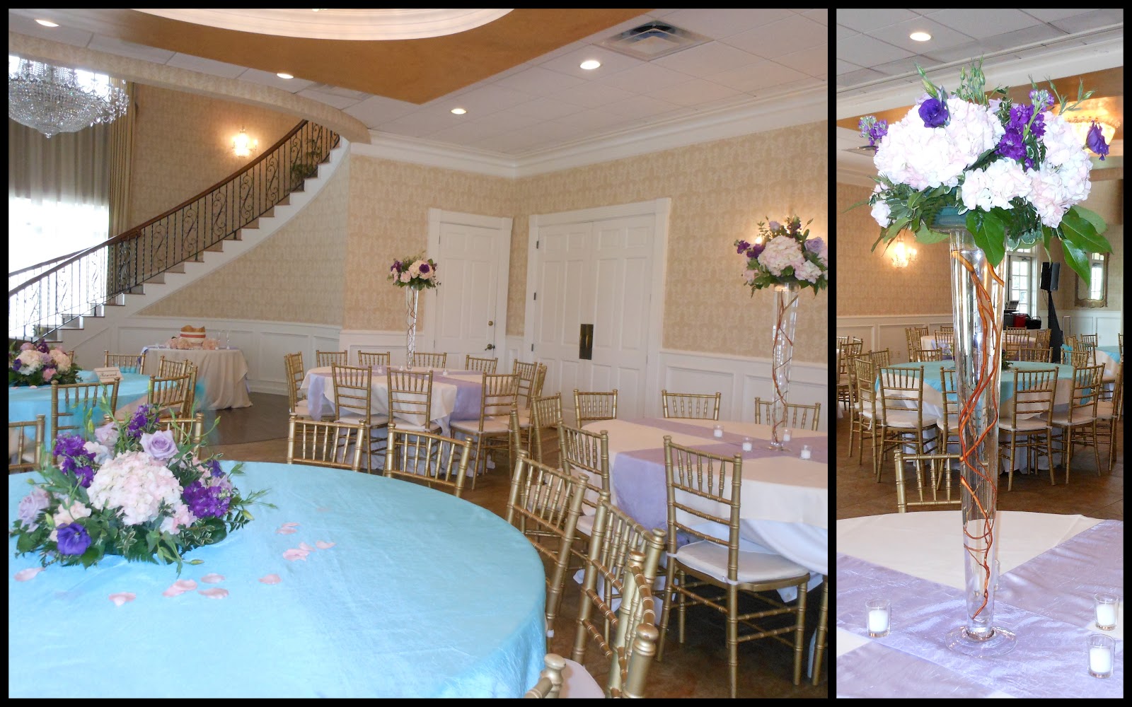 {Augusta Pines: Lavender, plum and white arrangements. Tall arrangement: mixed with stock, hydrangea and lisianthus. Low mixed arrangement: white hydrangea, lavender roses, lisianthus and stock. Low arrangement white hydrangea tinted purple in a glass bowlie with an underwater light.}