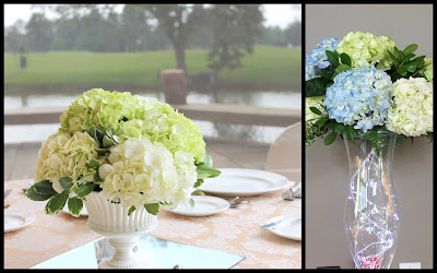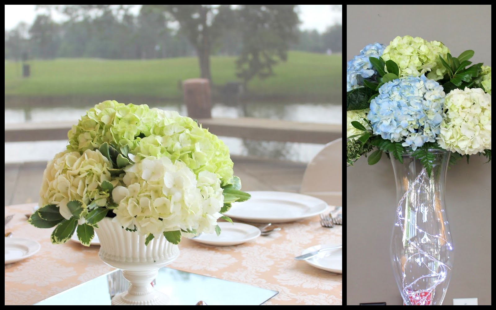 Table arrangements with white and green hydrangea, sign in table arrangement with blue, green and white hydrangea.