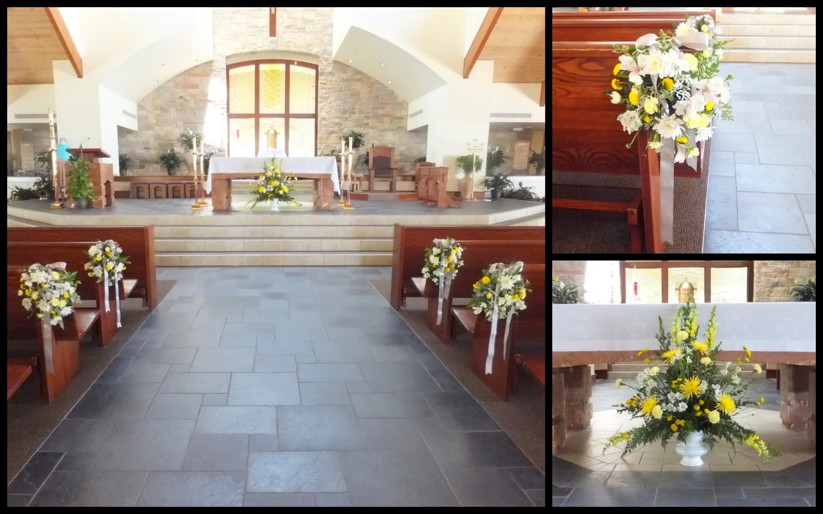 Ceremony decor of white and yellow pew clusters with dove grey ribbon and yellow and white altar arrangements in a traditional style.