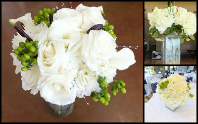 Bridal bouquet of white roses, green hypericum, white hydrangea, white miniature calla lilies, and monkey tails. Table arrangements with white hydrangea, green hypericum and white roses.