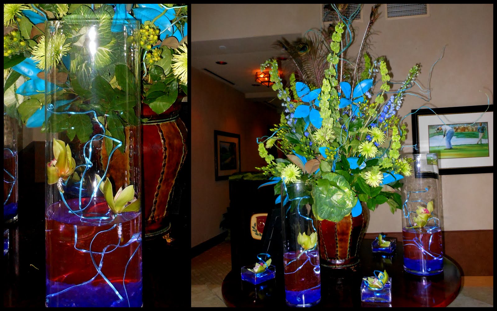 This trio of arrangements is done in the same beautiful colors with fun accents of underwater lights and submerged orchids and wire ornaments.