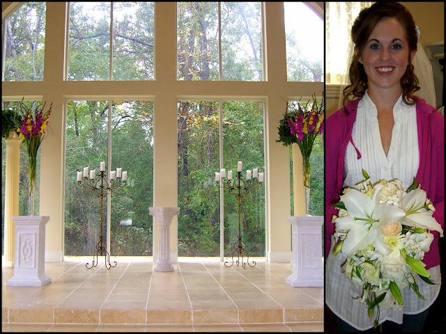 We also had a beautiful wedding on The Woodlands Resort and Conference Center Forest Deck. I love the way rose petals look along the aisle on the deck. It softens everything up and makes it feel so much more romantic. The coordinating centerpieces sat atop our rental fluted vases with hot pink miniature garden roses, lilies, and soft fillers with a mixture of greenery.