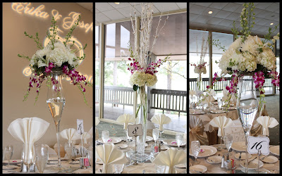 Part 2 of this post takes us to the reception at The Woodlands Resort and Conference Center in The Emerald Ballroom. These beautiful arrangements were AMAZING! Filled with white hydrangea, white spider mums, white oriental lilies (which made the room smell heavenly), white larkspur and bombay purple and white dendrobium orchids they made you say "wow" as you walked in the ballroom!