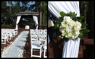 The Forest Deck at the Woodlands Resort and Conference Center is a beautiful place to get married. The curtains with floral tie backs of roses and hydrangea fit perfectly with a white aisle runner and rose petals.