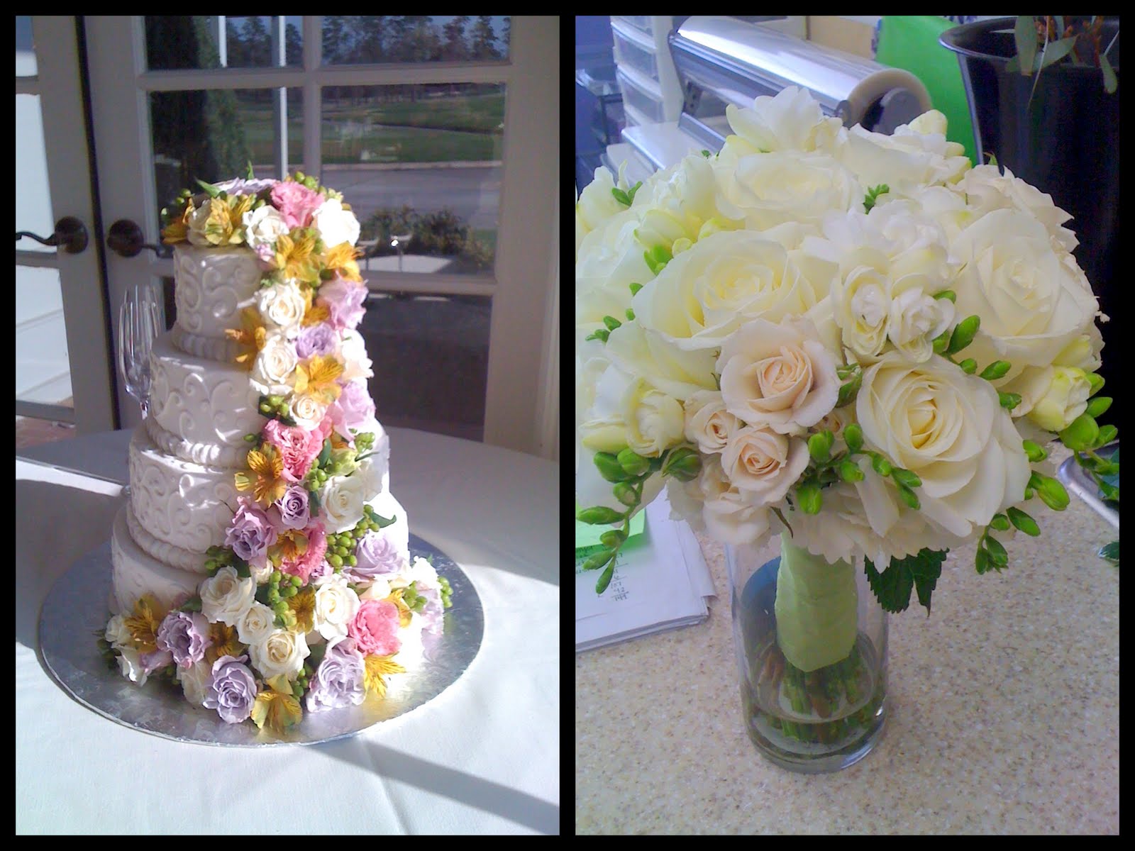 There is something so refreshing about spring colors and this wedding showcased them at their finest. The cake was adorned with a beautiful cascade of yellow alstromeria, lavender miniature garden roses, dusty pink lisianthus, green hypericum and white miniature garden roses. While her bouquet was a soft mix of whites, ivories and greens with roses, freesia, hydrangea, and miniature garden roses.