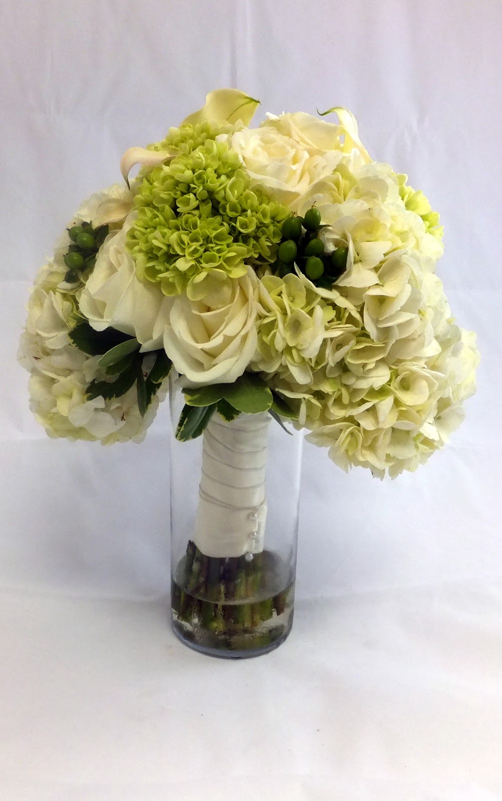We love posting weddings in their entirety, but sometimes it's fun to see pieces of the weddings we've done side by side. One of my favorite pieces to compare are the bridal bouquets. (white hydrangea, white roses, green miniature hydrangea, white miniature calla lilies, green hypericum berries.)