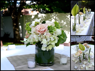 With a timeless soft white, fresh green and champagne color scheme this wedding was truly stunning. The rehearsal dinner was Friday night at the bride's home. We used a cluster of bud vases each filled with either an anthirium, rose, or rannuncula and accents of grass on half the tables and on the head table, while the other tables held a low, full and luscious arrangement with a mix of hydrangea,... -