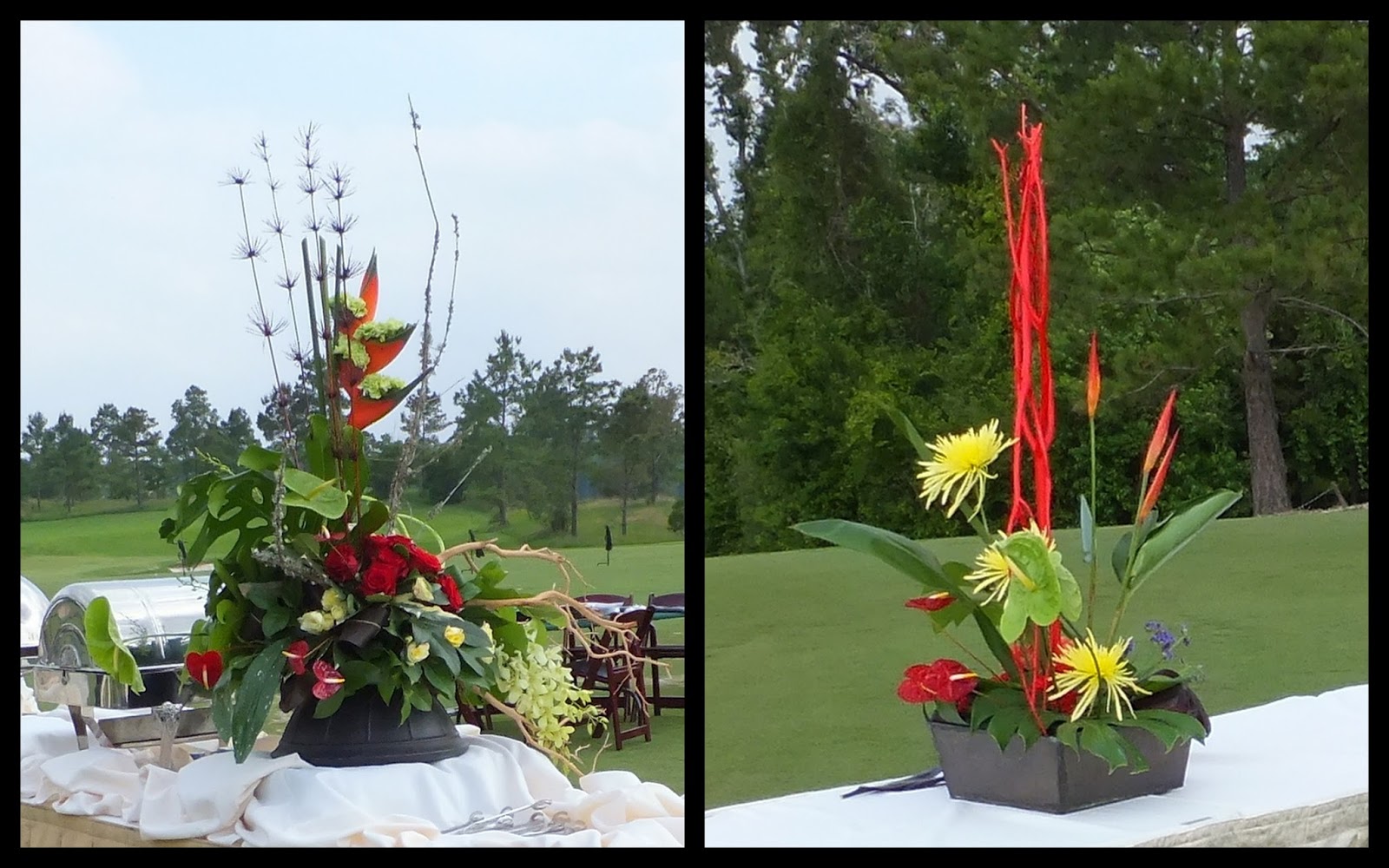The Club at Carlton Woods is a lovely place for any event, from intimate dinners to lavish receptions, the accommodations are wonderful. The centerpieces above were made with vivid two tone roses, blue hydrangea and orange tulips, and green cymbidium orchids with accents of greenery.
