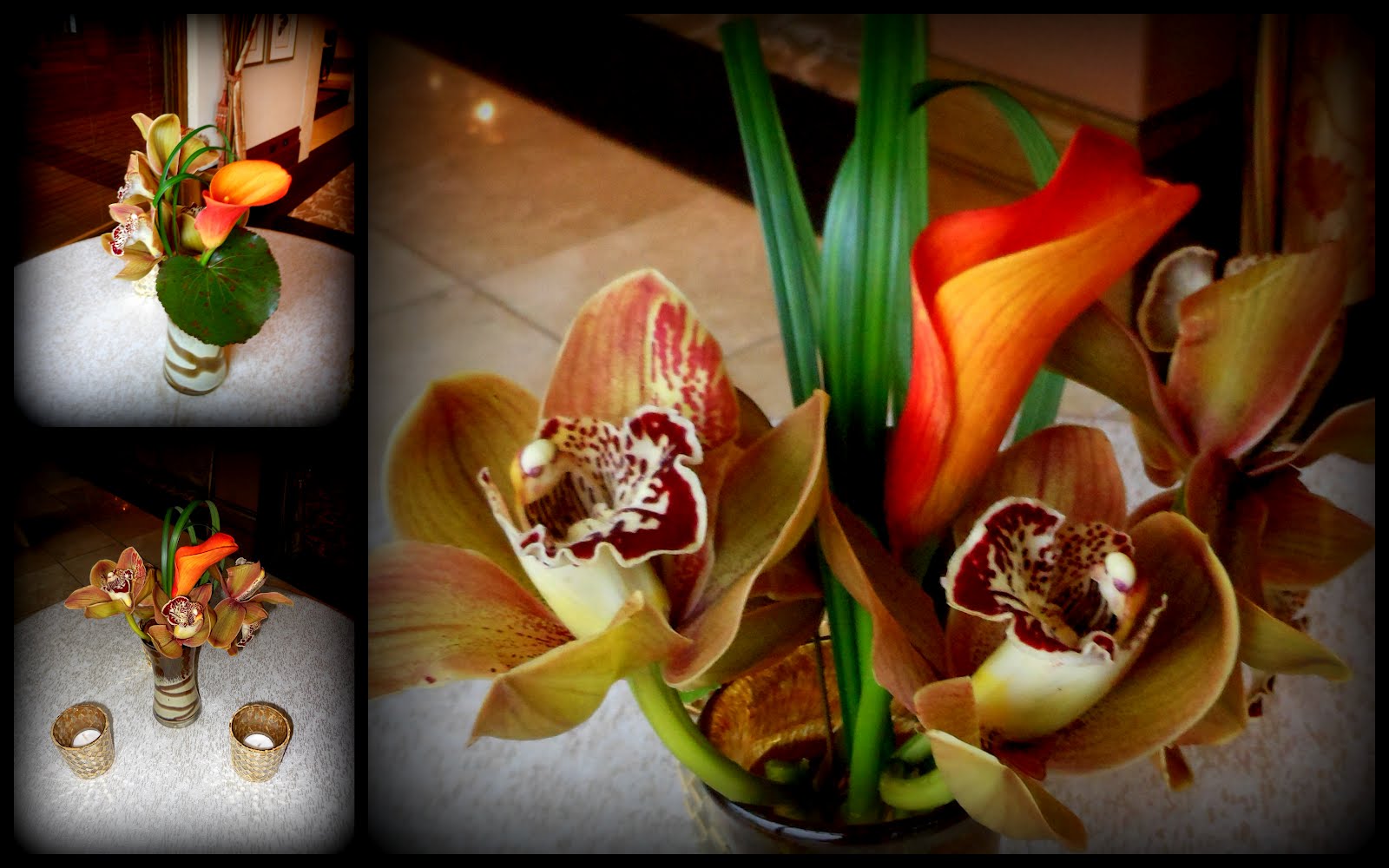Vibrant orange two tone roses, butterscotch cymbidium orchids, red lilies, brown hypericum berries, succulents, lotus pods, striped aspidistra leaves and loops of curly willow gave these... -