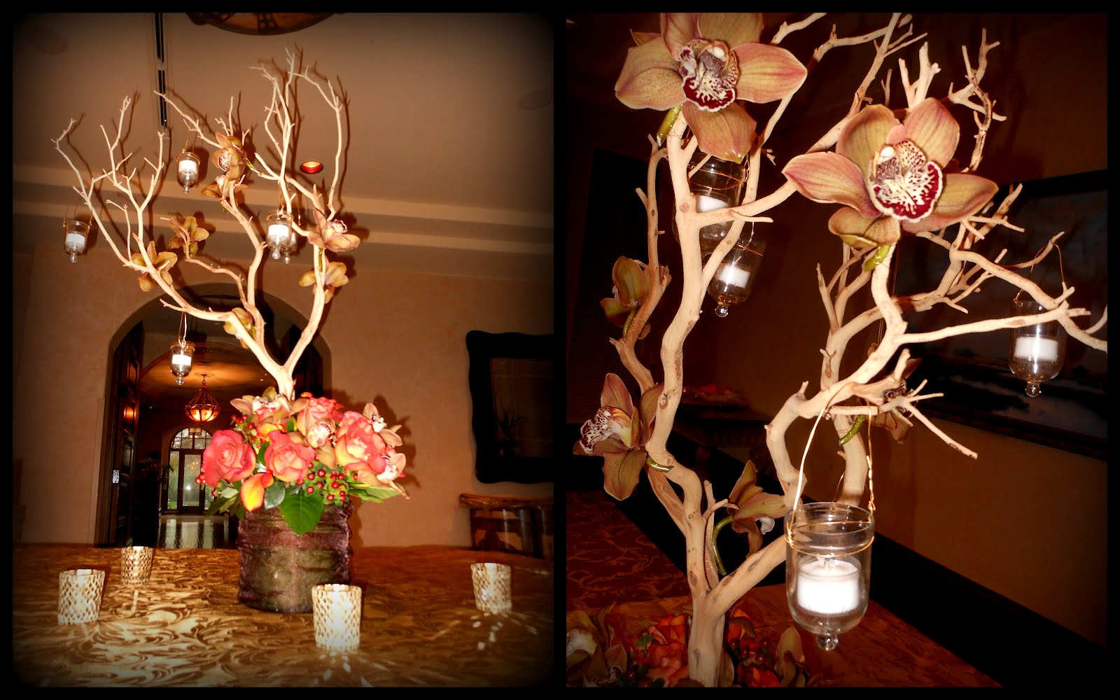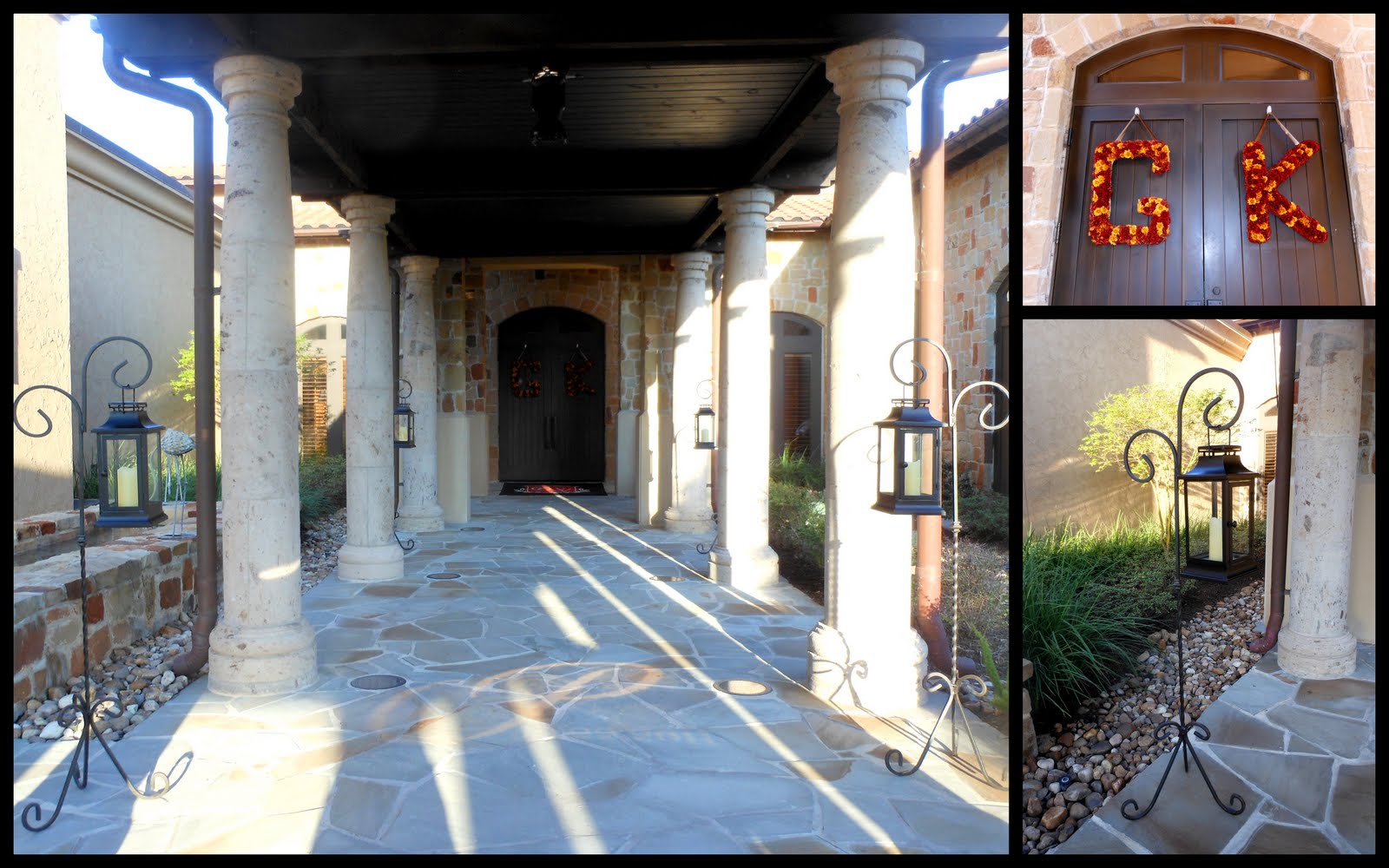 ... Now on to the reception. The newlywed's reception was held at The Carlton Woods Creekside Fazio club house. To dress up the entry walkway we continued the theme of iron with shepherd hooks and lanterns. (right before the guests began arriving we also laid down a heavy layer of rose petals along both sides of the walkway). On the doors we hung the couples initials which were made from autumn...