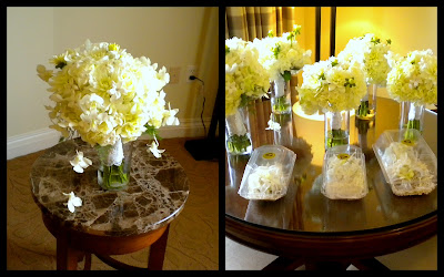 {Bouquets in a handtied style with white hydrangea, white dendrobium orchids and stephanotis)
