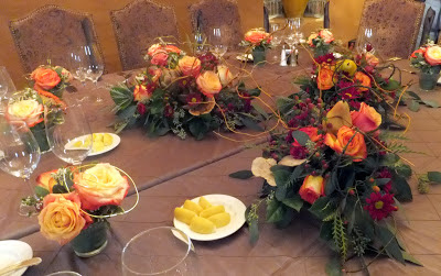 This beautiful combination of terracotta roses, mango calla lilies, and chocolate cymbidium orchids was a delicious centerpiece for an exclusive dinner for the owners of The Club at Carlton Woods.