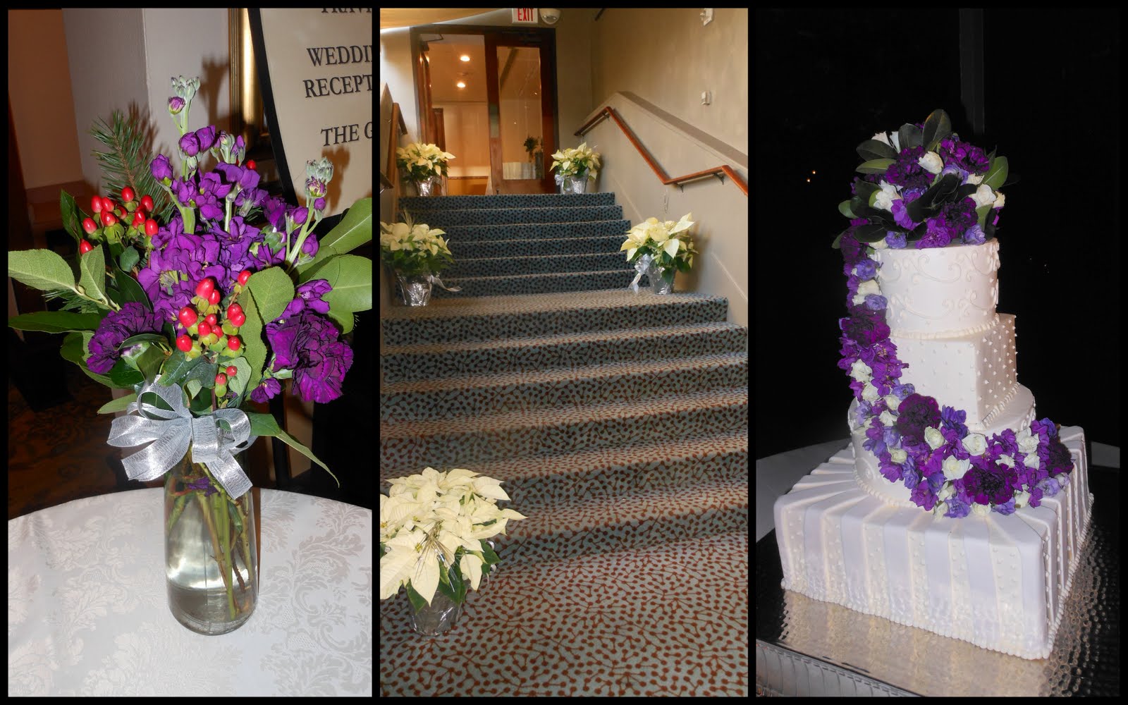 When I see red and purple together I can't help but think of a kings thrown room draped with deep red velvet draped and purple robes with gold accents. This brides decor reflected that same sophistication. The arch for her ceremony was covered in white lilies, red roses, dark purple carnations and a variety of greens, creating a lush garland type feel.