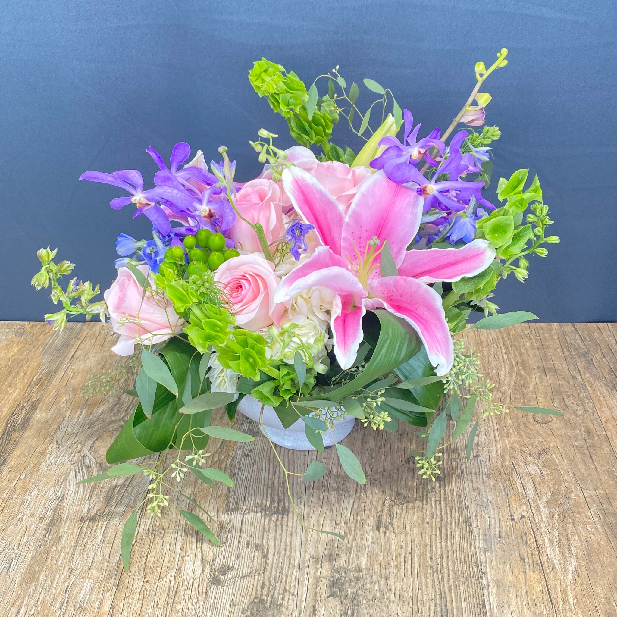 This unique design in shades of purples, greens, and blues feature an assortment of Hydrangea, Roses, Orchids, and other seasonal blooms in a ceramic compote container.