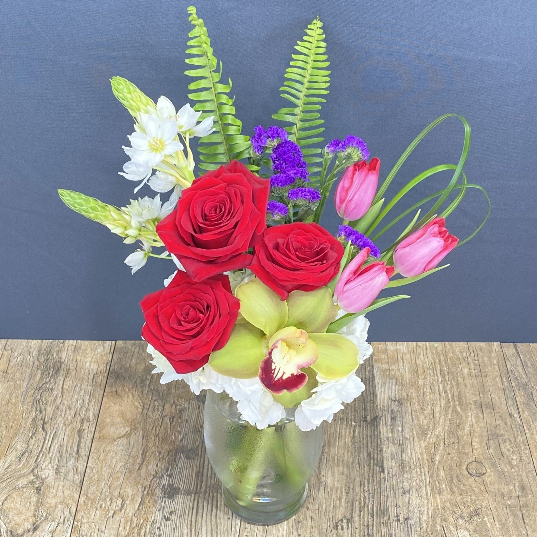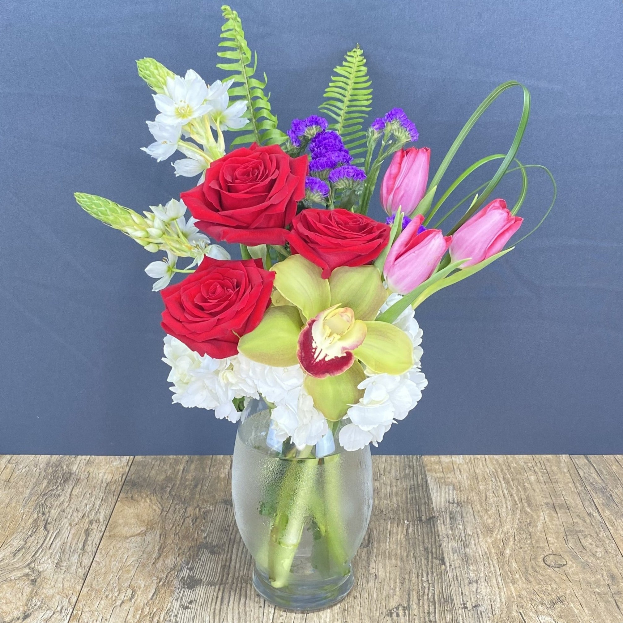 A sweet assortment of red roses, hydrangea, tulips, and other seasonal blooms.
